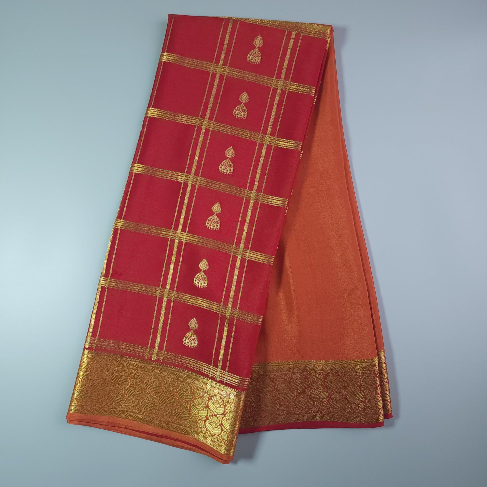 Silk Mark Certified Half n Half Pure Mysore Crepe Silk Saree with Jumka Design (Red & Orange combo)