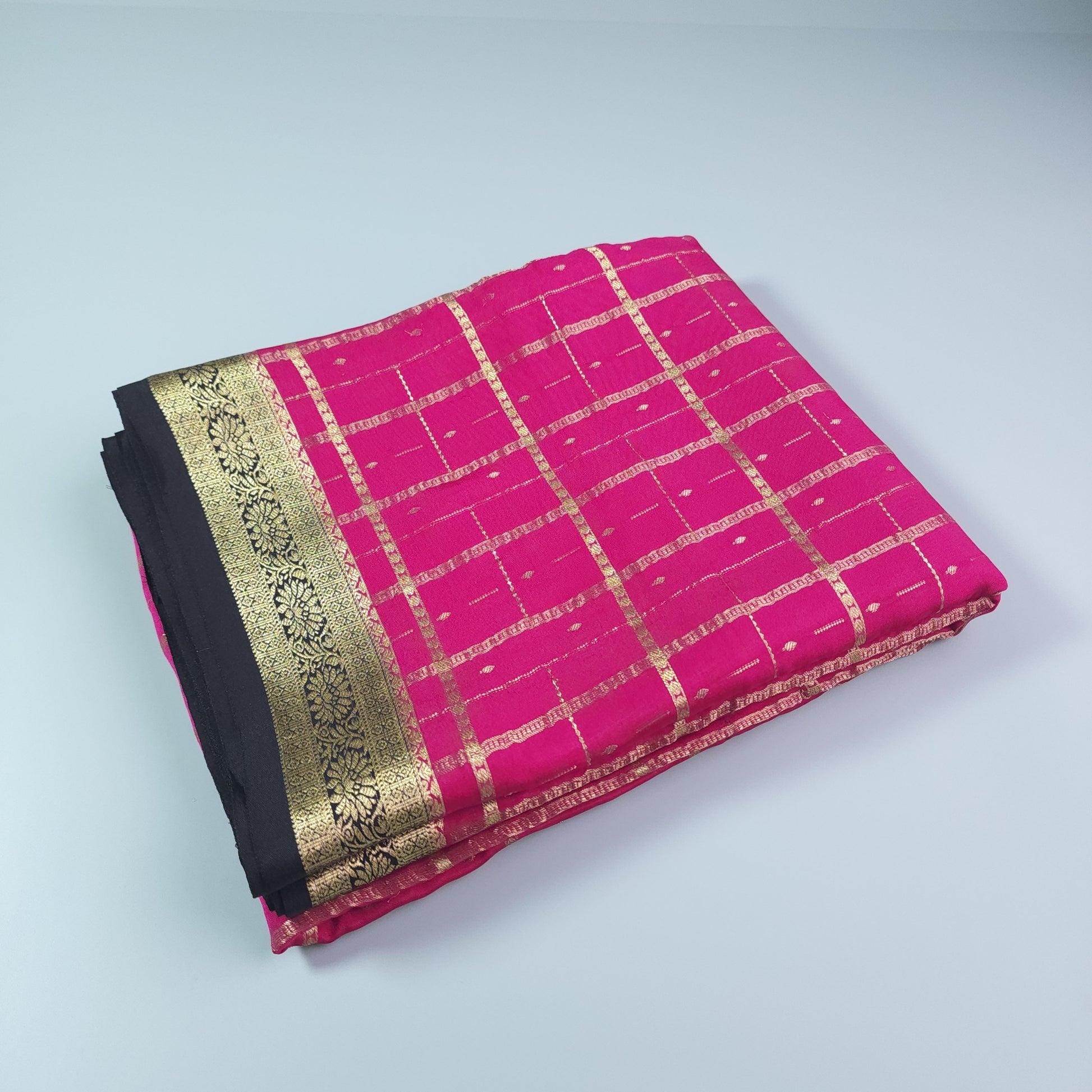 Silk Mark Certified Pure Mysore Crepe Silk Saree Checks with Butta (Rani pink with Black Border)